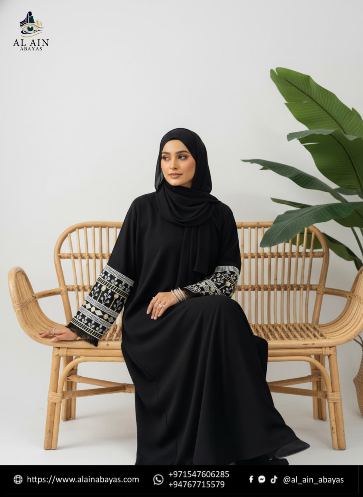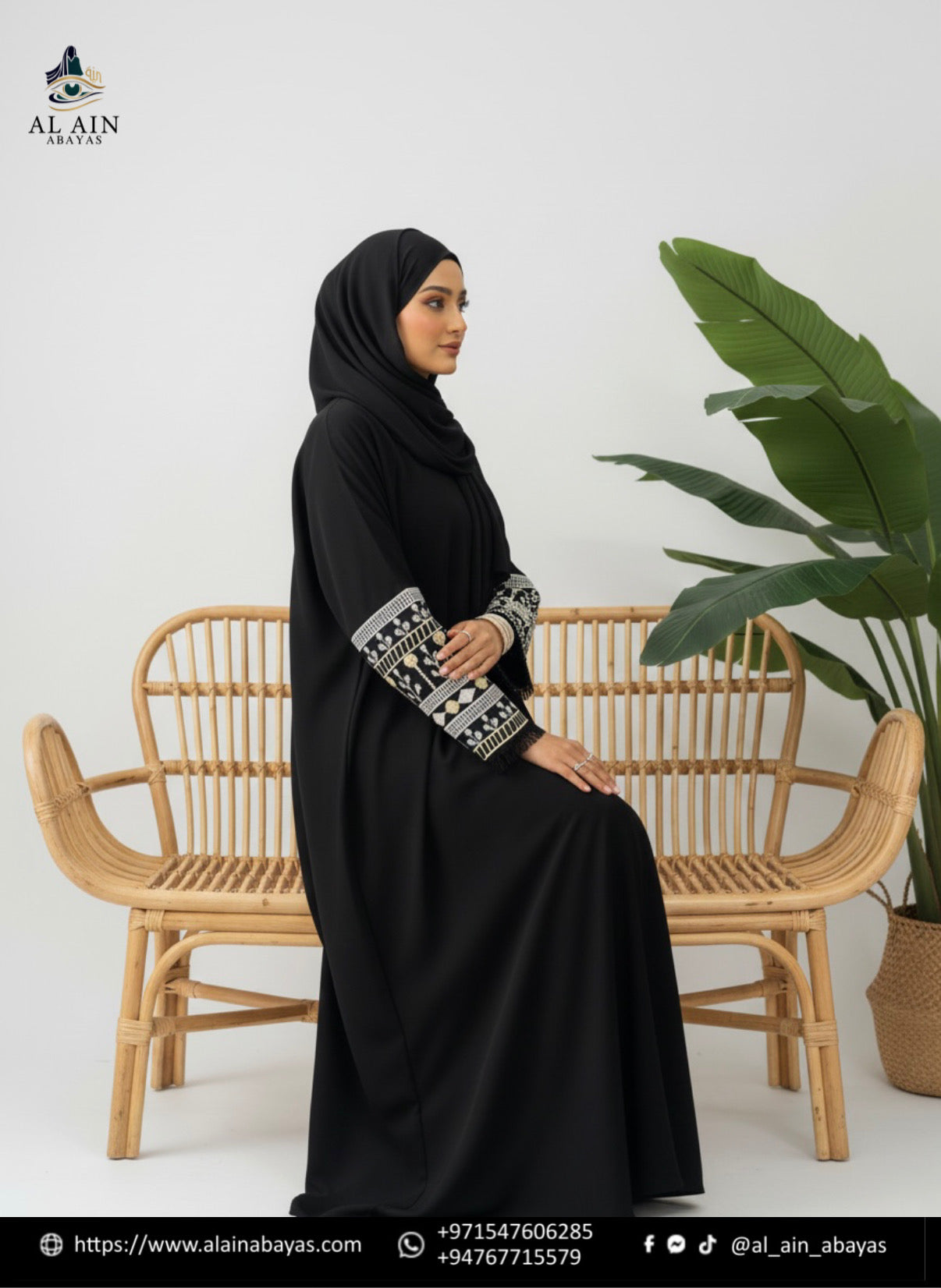Elevate your everyday wardrobe with our Heritage-Sleeve Abaya. Designed for the woman who appreciates traditional aesthetics with a contemporary touch, this piece features stunning monochromatic embroidery on the sleeves, inspired by classic patterns.